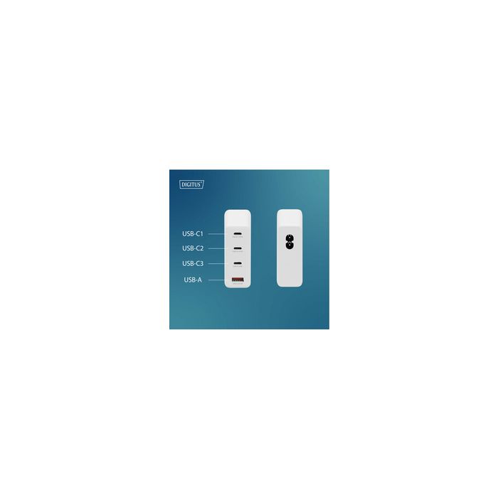 DIGITUS Chargeur secteur USB GaN, 3x USB-C / 1x USB-A, 140 Wtechnologie GaN II, chargeur compact, sûr et efficace, ports: 3x USB-C + 1x USB-A, puissance max. avec connexion unique, USB-C1: 140 W, USB-C2: 100 W, USB-C3: 65 W, USB-A: 22,5 W, couleur: blanc (DA-10305) dimensions: (L)30 x (P)72 x (H)72 mm