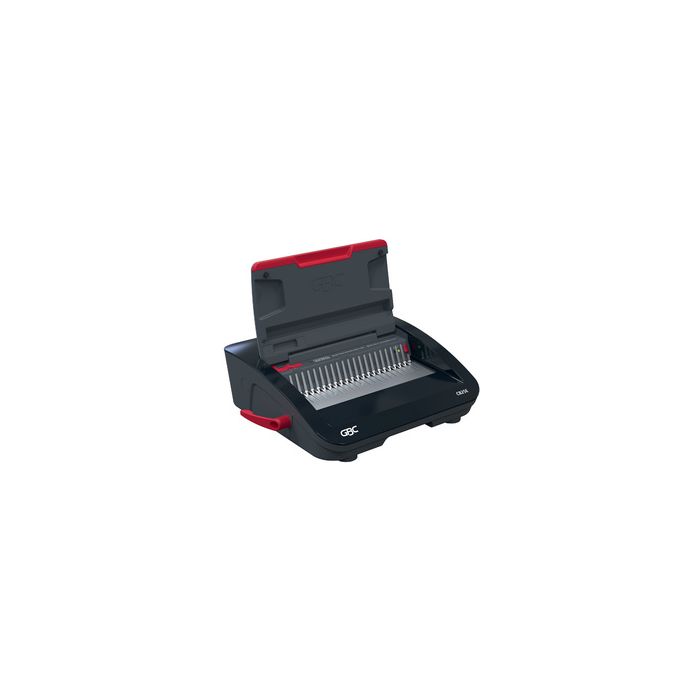 GBC Perforelieuse électrique CombBind CB25E jusqu'à A4, capacité de perforation: 25 feuilles, capacité de reliure: 390 feuilles, diamètre max. du peigne: 45 mm, perforation électrique, 21 trous, affichage LED contre les bourrages, dimensions : (L)468 x (P)394 x (H)327 mm, (4410064) prise euro, couleur: noir/rouge/argent