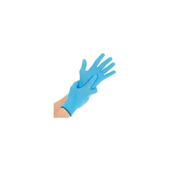 HYGOSTAR Gant de travail ALLFOOD, M, bleu taille 8, nylon flexible à maille fine, avec bord-côte, convient pour le contact alimentaire, résiste à l'abrasion, jauge 13, longueur: 240 mm en paquet de 12 paires dans un sachet (332655)