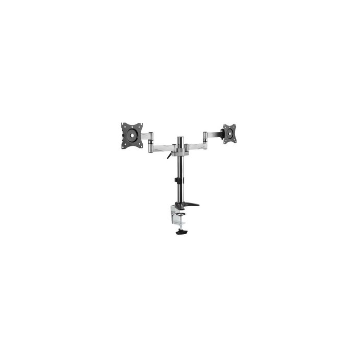 LogiLink Bras support pour 2 écrans, longueur bras: 342 mm avec pince, pour écrans de 33,02 à 68,58 cm (13-27"), capacité de charge: 8 kg par écran, inclinaison: +/- 35 degrés, pivotement: 180 degrés, rotation: 360 degrés, hauteur du mât: 365 mm, en aluminium & acier, noir/gris (BP0077) compatible VESA 75x75 et 100x100