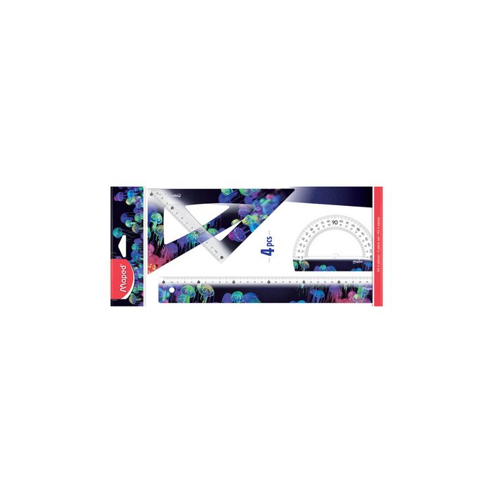 Maped Kit de géometrie DEEPSEA PARADISE, 4 pièces en plastique, avec motif méduses, contenu: règle 300 mm, équerre 60 degrés 210 mm, équerre 45 degrés 210 mm, rapporteur 180 degrés 120 mm (981833)