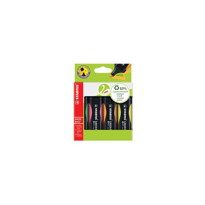 STABILO Surligneur GREEN BOSS, étui en carton de 4 à 83% en plastique recyclé, pointe biseautée, largeur du tracé: 2,0 - 5,0mm, peut rester ouvert jusqu'à 4 heures, encre rechargeable à base d'eau contenu: 4 pièces (6070/4) assorti dans les couleurs: vert, rose, orange et jaune
