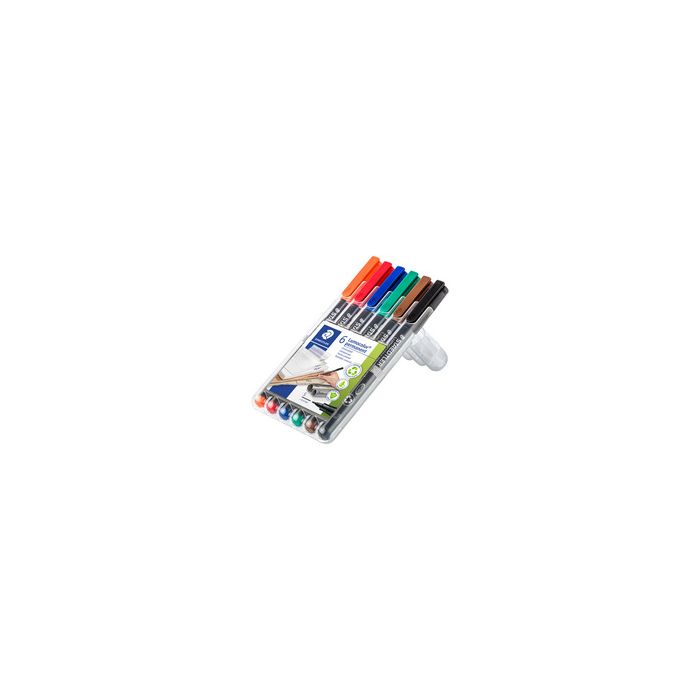 STAEDTLER Marqueur permanent 313S Lumocolor, étui de 6 largeur de tracé: 0,4 mm (S), pointe fine, ineffacable et résistant à l'eau, rechargeable, couleurs assorties: noir, rouge, bleu, vert, marron, orange contenu: 6 pièces (313 WP6) corps noir / embout et capuchon à la couleur de l'encre, dans un étui chevalet STAEDTLER breveté >> aussi utilisable comme marqueur OHP et CD